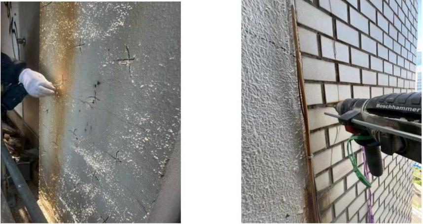 練馬区の築40年程度が経過するマンションの外壁塗装工事ですが、高圧洗浄が終わりましたので塗装前の下地補修を行っている様子です。こちらはドリルで外壁に穴をあけています。初めて見る方は大丈夫?と思われるかもしれませんが、これも下地補修工程の一つなので問題ありません。